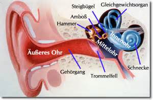 Einen schematischen Querschnitt durch das Ohr mit seinen drei Hauptbereichen (Außen-, Mittel- und Innenohr) zeigt die nebenstehende Abbildung.