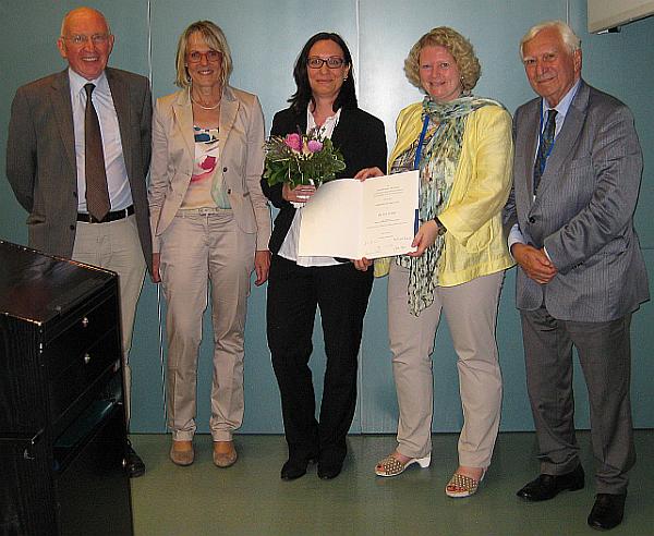 Frau Dr. Ina Oehme hat sich mit der Arbeit „Histone deacetylase 10 promotes autophagy-mediated cell surviva", veröffentlicht in PNAS (Proceedings of the National Academy of Sciences of the United States of America), beworben. Sie arbeitet in Heidelberg im Deutschen Krebsforschungszentrum (DKFZ). Das Foto ist anlässlich der Preisverleihung in Berlin entstanden: Prof. em. Günter Henze (Berlin), Dr. Marilen Macher (Stifterverband), Dr. Ina Oehme (DKFZ), Prof. Angelika Eggert (Laudatio, Berlin), Prof. em. Michael Hertl (Kuratorium Stifterverband) (v.l.n.r.)