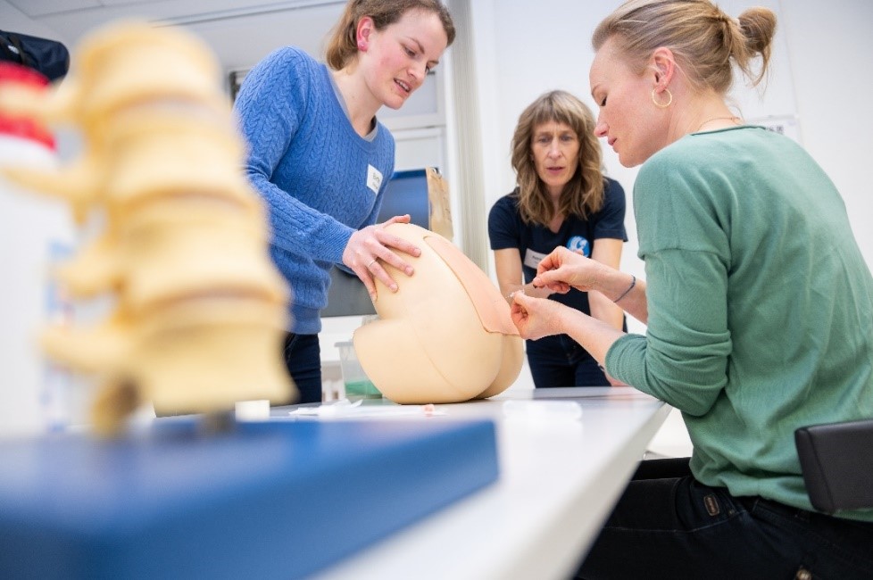 Abbildung 1: Die korrekte Durchführung einer Lumbalpunktion wird am Modell geübt. Bei korrekter Lage der Punktionsnadel wird Liquor aufgefangen (Foto:medJunge)