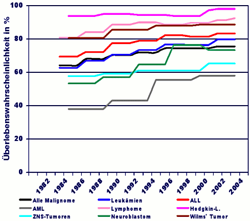 Die seit 20 Jahren in Deutschland durchgeführten Therapiestudien haben einen nicht unwesentlichen Anteil an den heute international möglichen Therapieerfolgen in der Pädiatrischen Onkologie. Bei optimaler fach- und altersgerechter Versorgung können heute nach Angaben des Deutschen Kinderkrebsregisters über 75 % aller krebskranken Kinder und Jugendlichen geheilt werden. Zum Teil sind die Unterschiede zwischen den einzelnen Erkrankungsarten jedoch erheblich. Die 5-Jahres-Überlebensraten betragen über 90 % für das Hodgkin-Lymphom und das Retinoblastom, über 80 % für die akute lymphoblastische Leukämie, die Non-Hodgkin-Lymphome, den Wilms-Tumor und Keimzelltumoren, über 60 % bei Hirntumoren und Weichteilsarkomen und über 50 % für die Erkrankung mit der derzeit noch ungünstigsten Prognose im Kindes- und Jugendalter, der akuten myeloischen Leukämie.