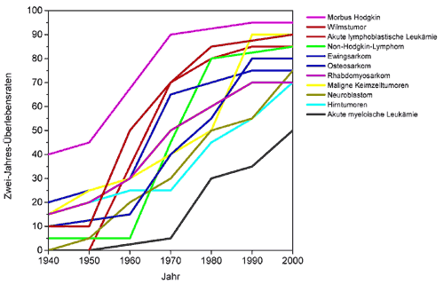 Das seltene Vorkommen von Krebskrankheiten bei Kindern und Jugendlichen und die Notwendigkeit einer hohen ärztlichen und pflegerischen Erfahrung in der Steuerung der Therapie und ihrer Nebenwirkungen haben zu einer regional weiträumigen Zentralisierung der Patientenversorgung in speziellen Kliniken geführt. Darüber hinaus ist in der Pädiatrischen Onkologie auch in großen Zentren nur dann ein auswertbarer Therapieerfolg möglich, wenn mit anderen Zentren kooperiert wird. Diese Notwendigkeit hat dazu geführt, dass heute über 90 % der Patienten innerhalb von Studien behandelt werden, die damit ein Mittel zur Optimierung und Qualitätssicherung der Therapie geworden sind. Die folgende Graphik zeigt die Zunahme der Behandlungserfolge für einige häufige Krebserkrankungen bei Kindern und Jugendlichen. Auf der Horizontalachse sind die letzten 60 Jahre in 10-Jahres-Abständen, auf der Vertikalachse die Heilungsraten in Prozent dargestellt.